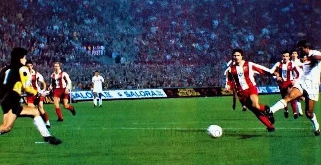 Una partita stranissima, in cui la Zvezda era stata a tratti superiore contro il Milan degli Immortali di Arrigo Sacchi. Due gol in due minuti, vantaggio belgradese con Stojkovic al minuto 47 e pareggio milanista con Virdis al minuto 48, poi più nulla, tutto rinviato alla sfida di ritorno al Marakana dove il verdetto sarà lungo, sofferto e contrastato.