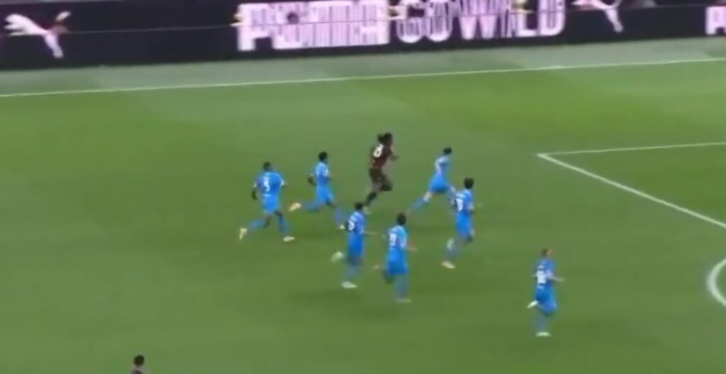Infatti, in una partita anonima di Leao, una sua giocata rimarrà iconica nonostante tutto. Nei concitati minuti finali, Rafa prende palla a centrocampo e inizia a puntare la porta avversaria. La difesa del Napoli si compatta, lo rincorre, lo accerchia. Alla fine perde il pallone, ma l’immagine resta indelebile: ben sette calciatori partenopei costretti a seguirlo, timorosi delle sue qualità.