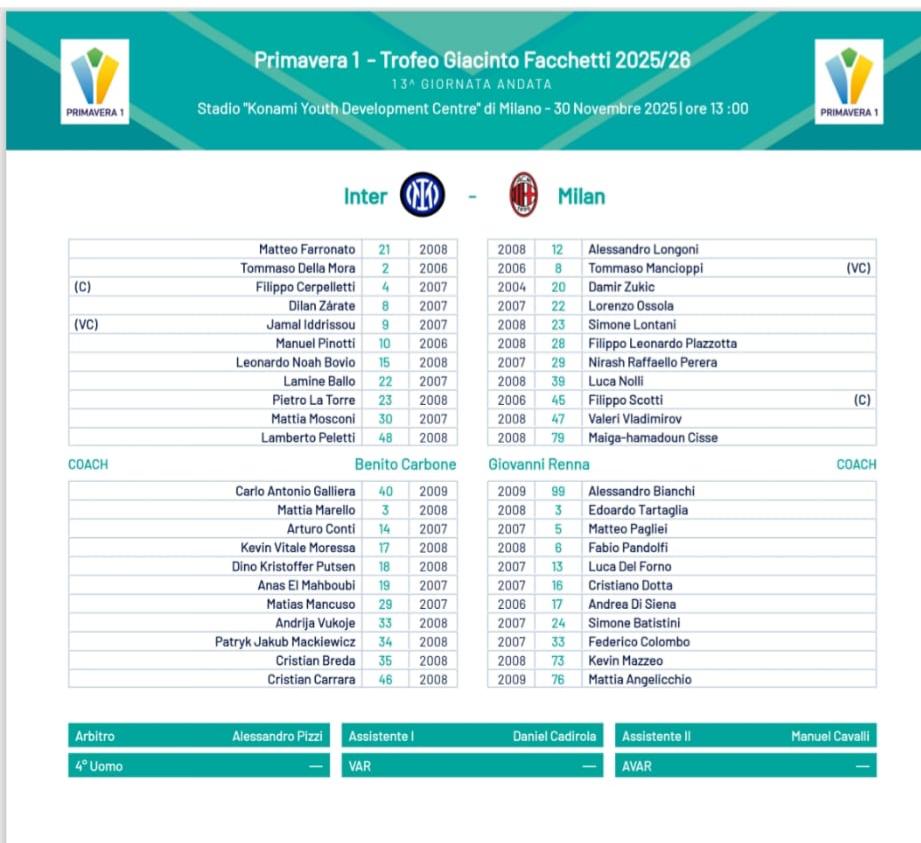 Le formazioni ufficiali di Inter-Milan Primavera