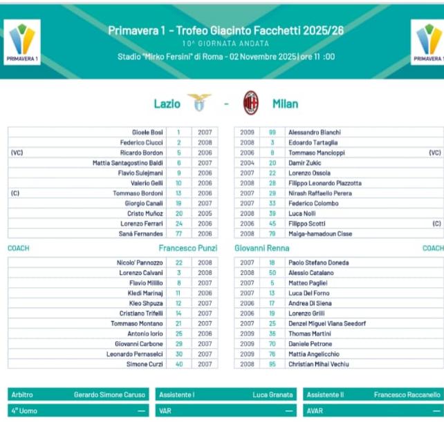 Le formazioni ufficiali di Lazio-Milan Primavera: