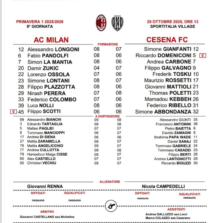 Le formazioni ufficiali di Milan Primavera-Cesena: