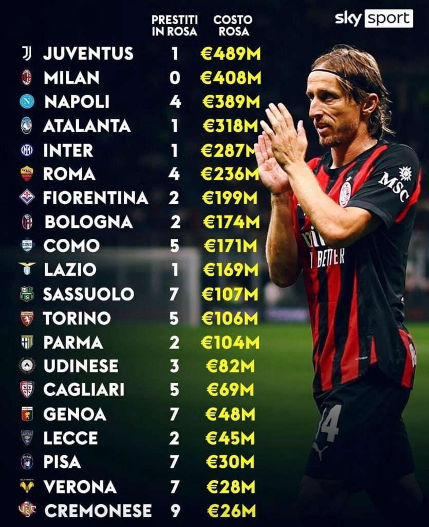 La vetta della classifica spetta alla Juventus, che con i suoi 489 milioni di euro resta la squadra con il costo rosa più elevato del campionato. Subito dietro, come detto, c’è il Milan (408M), seguito a ruota dal Napoli, vincitore di due scudetti nelle ultime tre stagioni, con 389 milioni.