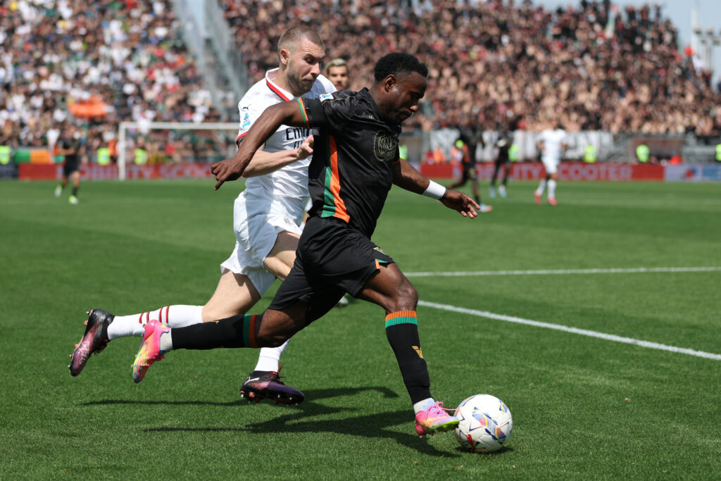Yeboah è l'uomo più attivo nella prima frazione del Venezia, prova a sgusciare per cercare di creare qualcosa nella metà campo rossonera e trova una punizione molto interessante al 30'. Sul punto di battuta va, però, Nicolussi Caviglia che sfiora il palo presidiato da Maignan e va vicinissimo alla rete del pareggio.Al 34' l'enorme costruzione del Venezia verrebbe premiata con Haps che mette in mezzo e trova puntuale Yeboah, che appoggia comodamente di sinistro alla destra di Maignan, lasciato tutto solo sul dischetto del rigore. Manganiello, però, interviene con revisione VAR per fuorigioco iniziale di Busio su passaggio precedente all'assist. Rossoneri graziati.