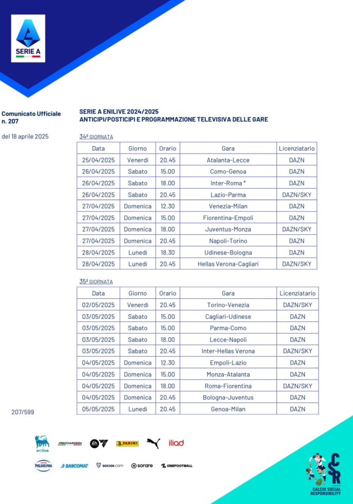 La Serie A Enilive 2024/25 entra nel vivo e adesso conosciamo date e orari dei prossimi appuntamenti che attendono i rossoneri di Mister Conceição. Ecco quando scenderemo in campo per la 34' e la 35' giornata di campionato: