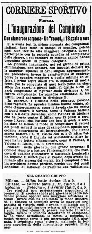 1^ giornata - Gruppo D, Italia Settentrionale, Campionato Prima Categoria Domenica 4 ottobre 1914 Arena Civica, Milano Reti: 6' Soldera I, 8' e 13' At. Trerè II, 24' e 36' Van Hege, 38' e 41' Brevedan, 53' Van Hege, 56' At. Trerè, 60' Van Hege, 61' Brevedan, 62' At. Trerè II, 68' Van Hege MILAN: L. Barbieri, M. Sala, Pizzi I, Soldera I, Lovati, At. Trerè II, Oleario, Er. Morandi, Bozzi, Van Hege, Brevedan - All.: Commissione Tecnica composta da Cesare Stabilini, Carlo Colombo e Mario Beltrami AUDAX MODENA: Preci, Ponti, Boni, Giorgi, Panini, Sarti, Cassinis, Marini, Vaccari III, Pratti, Piccinini - All.: Vaccari I Arbitro: Colombo di Milano Spettatori: 74.811Milan-Audax Modena 1914, l'archivio storico: le IMMAGINI