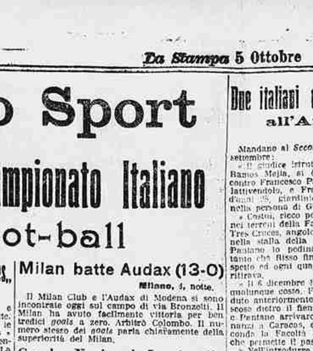 Nell’ottobre del 1914 il Milan… fa 13. Nel senso che ottiene la più ampia vittoria sul campo della sua storia. A farne le spese è l’Audax Modena, che soccombe sotto una raffica di reti in una delle ultime partite giocate dai rossoneri sul campo di via Bronzetti. A parziale giustificazione di una così pesante débâcle, i giornali dell’epoca riportano le numerose assenze in casa emiliana. Certo è che il Milan non deve aver frenato il suo impeto, visto il risultato a doppia cifra. Con l’Audax, società sciolta pochi anni più tardi, nel 1919, vanno a segno Van Hege (cinque volte), Trerè (quattro volte), Preveda (tre volte) e Soldera, al suo debutto, che apre le marcature dopo pochi minuti di gioco.