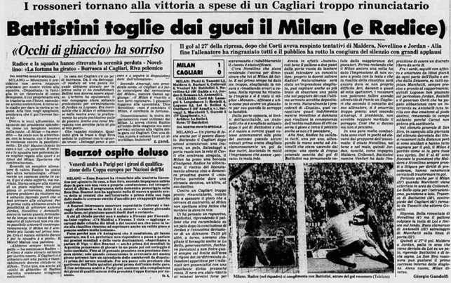 Nella ripresa, il Milan continuò a tambureggiare la trequarti cagliaritana. Antonelli, che aveva smarrito la vena realizzativa della stagione precedente in cadetteria, lisciò un ottimo pallone a due passi dal portiere avversario, per la disperazione dei tifosi, già pronti ad esultare, encomiabili nel loro sostegno incessante ed indefesso alla squadra. Buriani e Maldera crearono buone situazioni spingendo sulle fasce. Al minuto 73 arrivò la svolta della partita. Cross in area, conclusione a rete di Jordan, pallone colpito malamente che, complice una topica di un difensore sardo in fase di salvataggio, carambolò sulla traversa per finire dalle parti di Battistini che, come un rapace, lo insaccò di testa nella porta sguarnita. Fu la rete che portò due punti preziosi nell’asfittica classifica del Milan. Radice evitò l’esonero, dato per scontato dopo la netta sconfitta di Avellino prima della sosta.