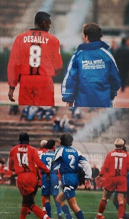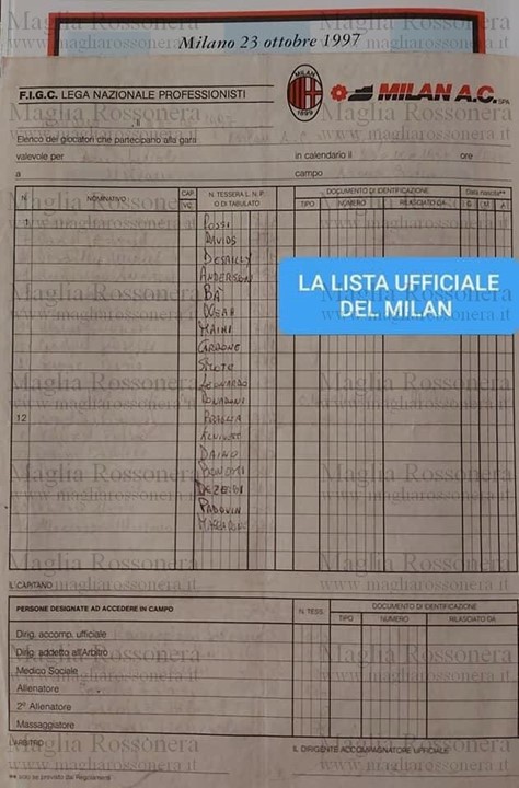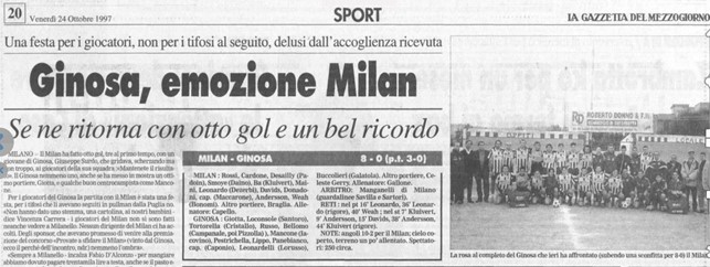 Amichevole Giovedì 23 ottobre 1997 Arena Civica, Milano Reti: Andersson (2), Leonardo, Kluivert su rigore, Leonardo su rigore, Kluivert, Weah, Davids. MILAN: Rossi; Cardone, Desailly (Padoin), Smoje (Bonomi); Ba (Daino), Leonardo (De Zerbi), Maini, Davids, Donadoni (Maccarone); Andersson, Weah (Kluivert) - All.: Capello GINOSA: Giotta, Loconsole (Santoro), Tortorella (Cristallo), Russo, Bellomo (Campanale, Pizzolla), Mancone (Lacovino), Pestrichella, Lippo, Panebianco (Caponio), Leonardelli (Lorusso), Buccolieri (Galatora) - All.: Gallone Arbitro: Manganelli di Milano Spettatori: 250 circaMilan-Ginosa 8-0 1997, l'archivio storico: VIDEO E IMMAGINI