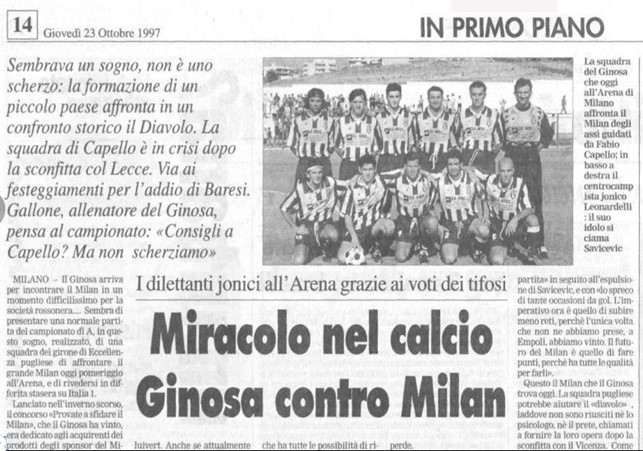 Stesso campo, stesse sensazioni. Uno storico raduno nel luglio 1986 all'Arena di Milano segnò l'inizio dell'era Berlusconi. Undici anni dopo, in quello stesso impianto, a entrare nella storia è il Ginosa, squadra di un paese tra Bari e Taranto vincitrice del concorso “Provate a sfidare il Milan”.