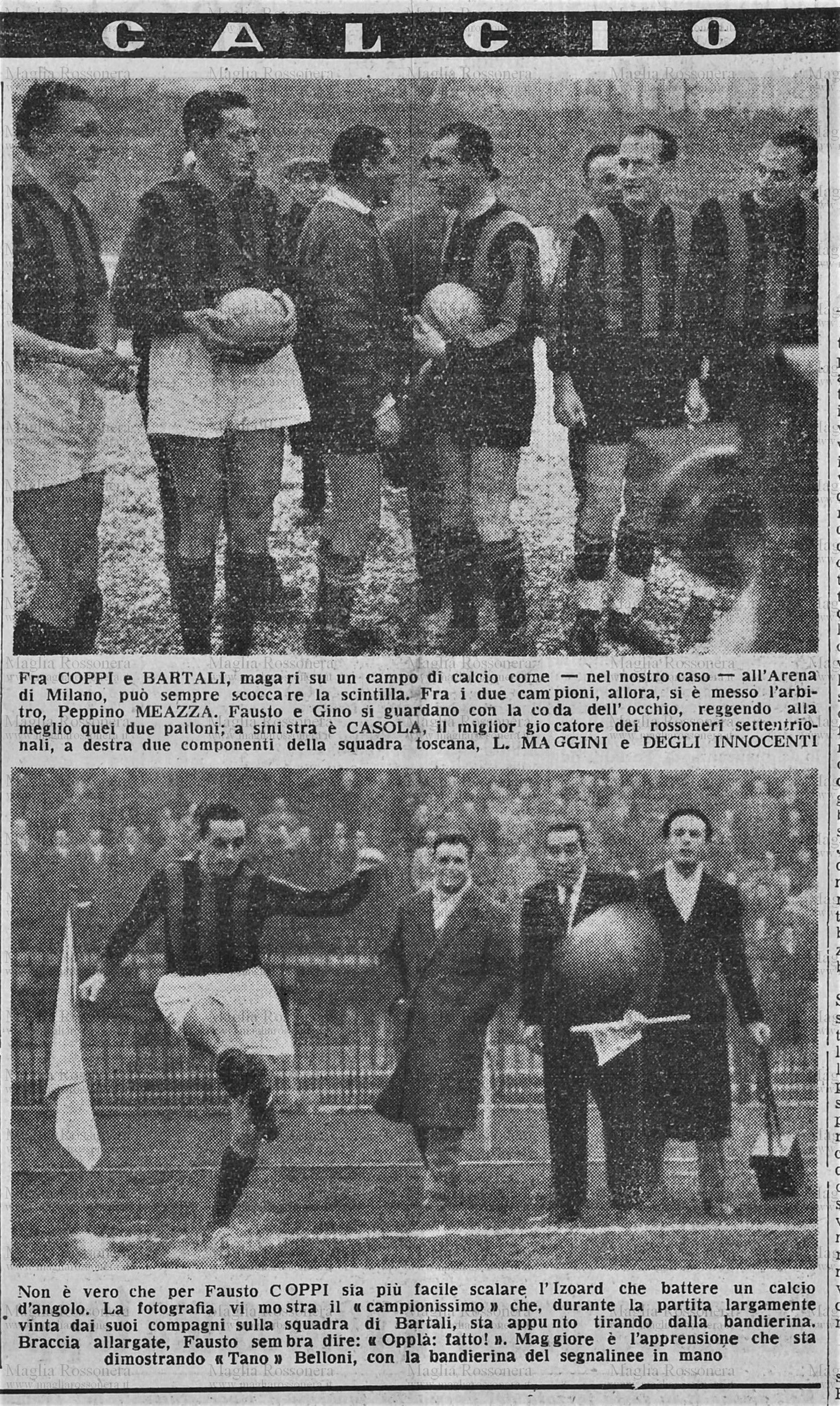 Coppi venne impiegato all’ala destra, il ruolo che, come evidenziato da Darwin Pastorin, si addiceva, almeno nel calcio d’una volta, ai ribelli, ai sognatori e ai fuggitivi. Lo stesso di Mané Garrincha e Pier Paolo Pasolini. Suo fratello Serse, invece, si sistemò sulla linea mediana. Nel ruolo di terzino destro venne schierato Primo Bergomi. In campo andò anche Valeriano Zanazzi, abile su strada e come ciclocrossista. Tra i nerazzurri, in porta venne impiegato Alfredo Martini mentre Bartali si posizionò all’ala destra, come l’eterno rivale Fausto. Dell’undici nerazzurro fece parte anche Vito Ortelli, ciclista che vantava un titolo italiano su strada e due su pista. Fu un derby senza storia, dominato dai rossoneri che annientarono i nerazzurri con un tennistico 6-0. L’incontro si chiuse già nella prima frazione dopo le doppiette del fromboliere Conte e di Casola, fresco vincitore della Milano-Torino e specialista della “Sei giorni” milanese su pista. Per l’Inter, solo un timido tentativo scaturito da un calcio d’angolo battuto da Bartali, con palla a lato. Il momento più esaltante del match giunse al 22’ della ripresa. Coppi, raccogliendo un lancio di Conte, superò in velocità due avversari. A pochi metri da Martini, che gli si parò davanti in uscita disperata, l’Airone mise la palla in rete con un preciso diagonale. Un gol da ala destra pura! Il boato di gioia dell’Arena salutò l’exploit di Fausto Coppi. La sesta marcatura di Casola, autore di una tripletta, completò il cappotto. Nell’arco dei novanta minuti di gioco si registrò soltanto un faccia a faccia tra Coppi e Bartali, immortalato da fotografi e telecineoperatori. A differenza della mitica foto del passaggio della borraccia, datata 1952, l’immagine scattata sul campo di calcio non lasciava spazio a dubbi, mostrando il netto anticipo di Coppi sull’arrancante Bartali, con “l’arbitro” Meazza ad osservare divertito.L'analisi della gara