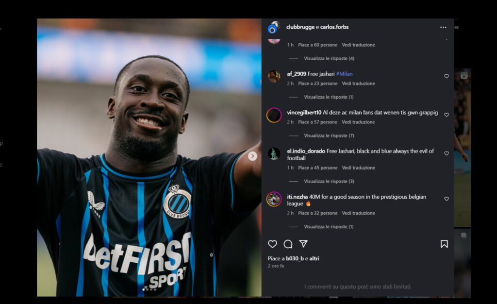 Il Club Brugge è in difficoltà nel gestire i propri social. Su Instagram i tifosi del Milan continuano a commentare su Jashari e il club è costretto a chiudere i commenti