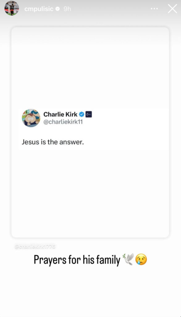 La storia Instagram di Pulisic per Charlie Kirk e la famiglia
