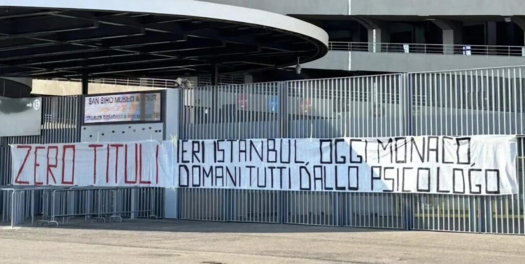 Era già accaduto nel 2023 al rientro dei nerazzurri da Istanbul, e le scritte imperversano a maggior ragione oggi. La Curva Sud Milano, cuore pulsante del tifo rossonero, non ha perso l’occasione per ironizzare sull’amara sconfitta dei cugini. E' apparso uno striscione pungente sui cancelli di San Siro.