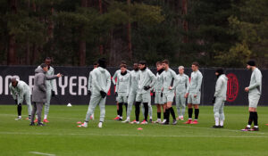 Ultime battute di un "torello" pre-allenamento a Milanello: per cercare di recuperare palla, Emerson "abbatte" Jovic...